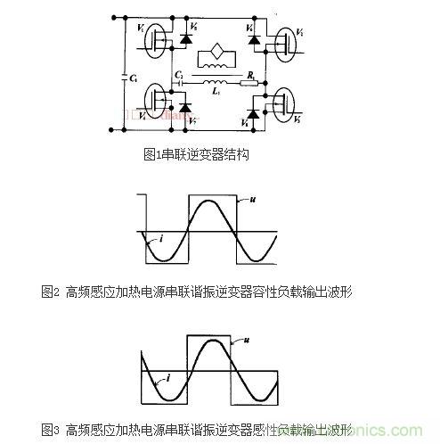 作為高頻感應加熱電源設備的重要組成部分,串聯(lián)諧振逆變器在工作中具有損耗低、工作適應性良好等優(yōu)勢。這種逆變器在實際應用中也被稱為電壓型逆變器,其基礎結構的原理圖如圖1所示。在實際工作的過程中,串聯(lián)諧振型逆變器的輸出電壓為近似方波。由于電路工作在諧振頻率附近,使振蕩電路對于基波具有最小阻抗,所以負載電流ia近似正弦波。同時,為避免逆變器上、下橋臂間的直通,換流必須遵循先關斷后導通的原則,在關斷與導通間必須留有足夠的死區(qū)時間。下圖中的圖2和圖3分別示出容性負載和感性負載的輸出波形。