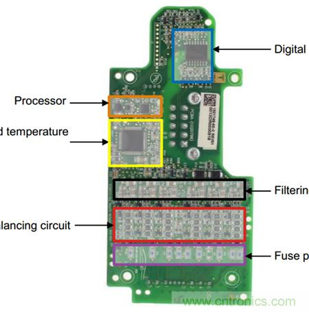 因為兩種均衡功能各有利弊,本來主動均衡功能是可以替代被動均衡功能的,但因為結構復雜成本高,而且結構復雜之后故障率也會高而與被動均衡處于膠著狀態,業內人士常為了哪種均衡更好爭論不休。特斯拉的BMS均衡功能(被動均衡,見下圖中Cellbalancingcircuit中所指均為放電電阻)經常被示范以證明被動均衡強于主動均衡。其實這反而證明了任何技術選擇都要和整體條件適用的道理。