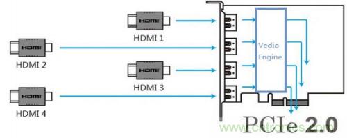 圖一是目前視頻采集卡非常主流的硬件架構,Vedio Engine包括視頻編解碼器和FPGA,協議以及算法都由FPGA來實現,后面通過FPGA的Serdes接口送出到電腦,采用X4 PCIE2.0總線協議。世強市場經理表示:PCIE總線發展到現在經歷了3代,分別是GEN1 2.5GT/S, GEN2 5GT/S, GEN3 8GT/S,如果設置成X4,GEN2就可以滿足20GT/S的帶寬,基本可以滿足目前主流高清帶寬需求,所以主流的視頻采集卡都采用PCIE2.0。