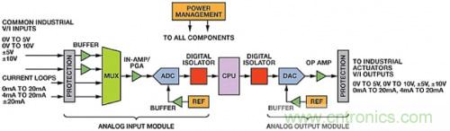 圖1顯示在工業(yè)自動(dòng)化和過程控制系統(tǒng)中使用PLC的簡化信號(hào)鏈。PLC通常包括模擬和數(shù)字輸入/輸出(I/O)模塊、中央處理器(CPU)和電源管理電路。
