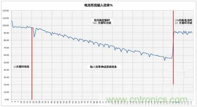 圖1中,關(guān)閉主動均衡控制的160次循環(huán)測試中,前20次的輸入效率保持在95%以上,一個非常平穩(wěn)的輸入效率,這就是“首20次循環(huán)現(xiàn)象”;在20次以后的測試中,電池系統(tǒng)的輸入效率隨充放電次數(shù)下降(充電和放電條件不變),在第40次時,約為90%,在第70次時,約為80%,在100次時,已經(jīng)降到70%,而在第160次時,約為55%。