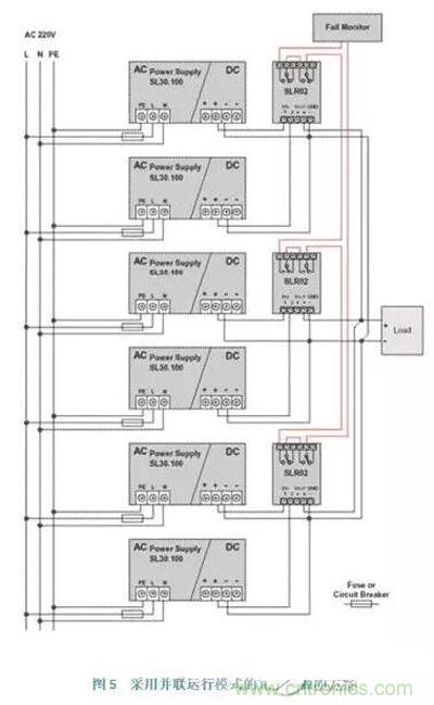 圖5表示了一個采用PULS電源實現的5+1的冗余電源的方案。其輸出功率為3 600W/24V/150A的并聯式冗余電源。這個方案采用了6個SL30.100和3個SLR02的冗余模塊。3個SLR02的冗余模塊將所有的電源工作狀態串接起來,成為一個綜合信號送入控制系統進行監控。每個SLR02的冗余模塊都能顯示所連接的電源工作狀態,隔離二極管也防止了輸出回路的短路現象的出現。