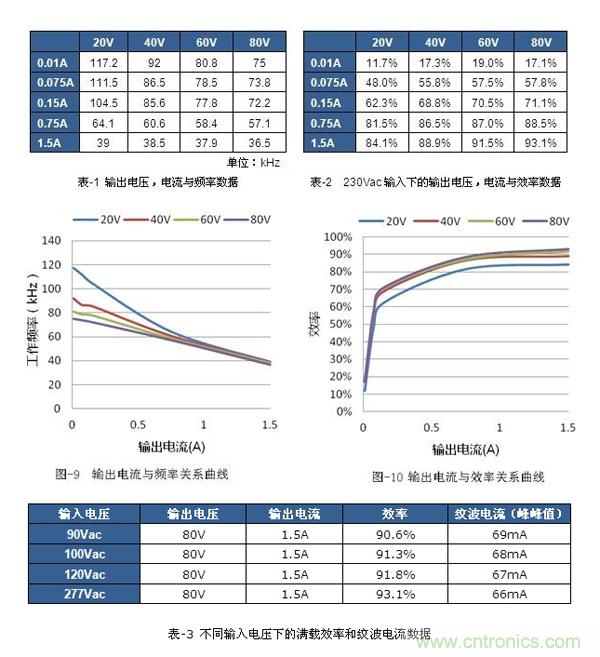 表-1是輸出電流與頻率在不同輸出電壓條件下的數據,圖-9是根據此數據畫出的曲線。整個輸出電壓(20-80V),輸出電流(0.01-1.5A)范圍內,頻率的變化范圍也只有80kHz左右的變化。特別是恒流在最大電流時,頻率的變化范圍只有幾kHz,恒定電壓在80V調光時,頻率范圍是39kHz左右。