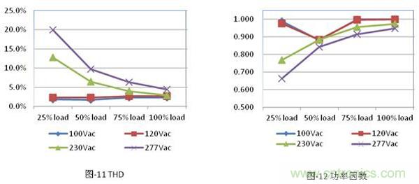另外,ICL5101的THD和PF性能也很出色,詳細數據分別如圖-11和圖-12所示。100%負載下,THD可低于5%。甚至在50%負載及277Vac條件下,THD小于10%,遠低于EN61000-3-2 class C要求。