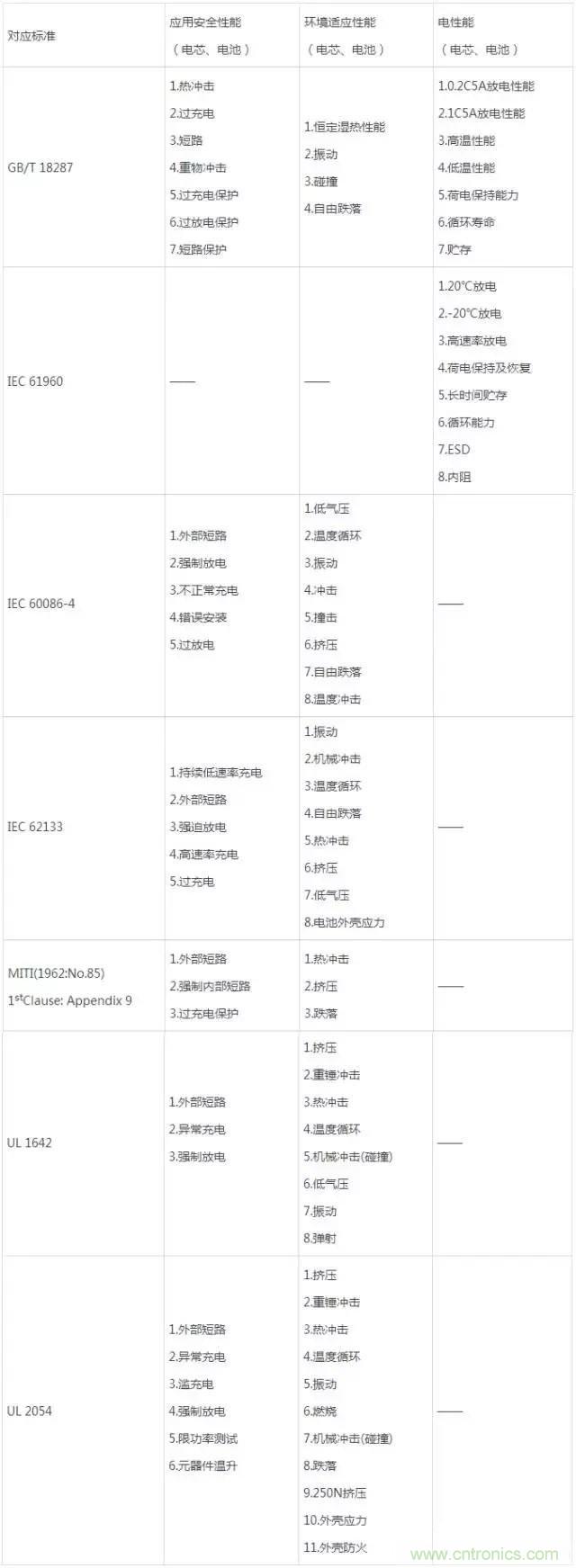 不同標(biāo)準(zhǔn)對(duì)電池的檢測(cè)各有側(cè)重: