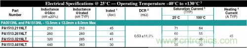 所以在實際的使用中,簡單來說,一般選擇兩個電流值里面比較小的那個作為設計限值。比如下圖中的4個PLUSE電感的 Irated,均取的Heating Current和Saturation Current其中的相對小的那個作為額定電流 。 (注意PA1513.321這個器件,為什么Irated不是45A?注意Pulse的Saturation Current定義為20%的電感值下降,41A的時候只有10%的電感值下降。)