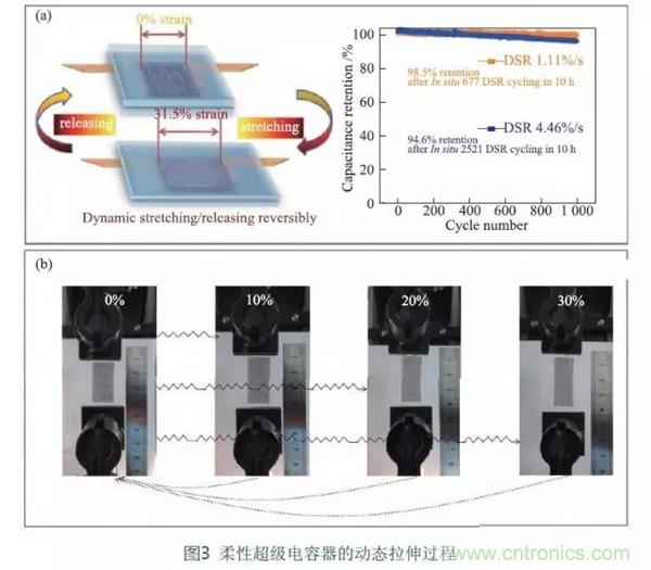 Zang等充分利用石墨烯網(wǎng)狀薄膜可與基底緊密結(jié)合的特點(diǎn),獲得以預(yù)拉伸后的褶皺PDMS為基底、石墨烯網(wǎng)狀薄膜為電極材料的可動(dòng)態(tài)拉伸(彎曲)超級(jí)電容器。動(dòng)態(tài)拉伸(彎曲)頻率可高達(dá)60%/s。拉伸過程通過CV曲線進(jìn)行實(shí)時(shí)檢測(cè),結(jié)果表明,動(dòng)態(tài)拉伸(彎曲)過程中未見明顯的性能破壞,具有很好的動(dòng)態(tài)變形性能。