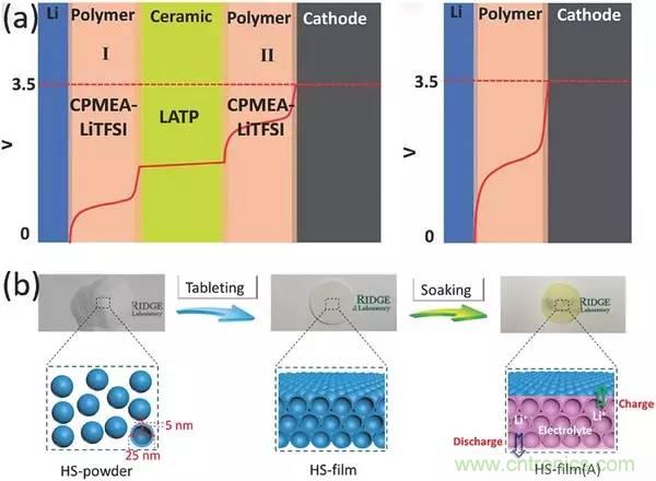 a)聚合物/陶瓷/聚合物-三明治電解質(zhì)(左),內(nèi)部曲線(xiàn)是固體混合電解質(zhì)和單個(gè)固體聚合物電解質(zhì)的電勢(shì)分布圖(右);
