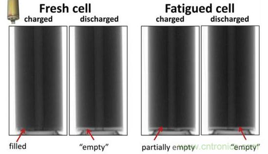 鋰離子電池主要由正極、負(fù)極、隔膜和電解液,以及結(jié)構(gòu)件等部分組成,在鋰離子電池的外部,通過導(dǎo)線和負(fù)載等,將負(fù)極的電子傳導(dǎo)到正極,而在電池內(nèi)部,正負(fù)極之間則通過電解液進(jìn)行連接,在放電的時候,Li+通過電解液從負(fù)極擴(kuò)散到正極,嵌入到正極的晶體結(jié)構(gòu)之中。所以在鋰離子電池中,電解液是非常重要的一環(huán),對鋰離子電池的性能有著重要的影響。理想的情況下,正負(fù)極之間應(yīng)該有充足的電解液,在充放電的過程中都應(yīng)該具有足夠的Li+濃度,從而減小由于電解液的濃差極化造成的性能衰降。但是在實際充放電過程中,受制于Li+擴(kuò)散速度等因素,在正負(fù)極會產(chǎn)生Li+濃度梯度,Li+濃度隨著充放電而波動。由于結(jié)構(gòu)設(shè)計和生產(chǎn)工藝等原因,還會導(dǎo)致電解液在電芯內(nèi)部的分布不均勻,特別是在充電的過程中,隨著電極的膨脹,會在電芯的內(nèi)部形成部分“干區(qū)”,“干區(qū)”的存在導(dǎo)致了能夠參與到充放電反應(yīng)中的活性物質(zhì)減少,引起電池內(nèi)局部SoC不均勻,從而導(dǎo)致電池內(nèi)局部老化速度加快。M.J. Mu hlbauer在研究鋰離子電池老化對Li分布的影響中曾發(fā)現(xiàn),由于在充放電過程中,正負(fù)極極片都存在一定體積膨脹,導(dǎo)致電芯也存在一定程度的體積膨脹和收縮,電芯會如同“呼吸”一般,反復(fù)的“吸入”和“吐出”電解液,所以不同時刻,電解液在電芯內(nèi)的浸潤情況也在實時變化(如下圖所示)。