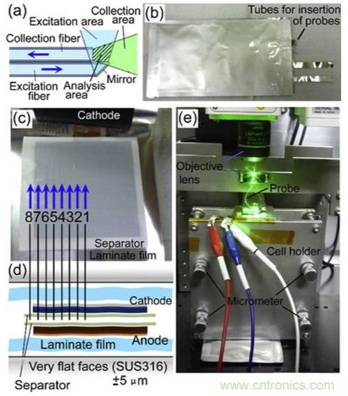 實驗中Toshiro Yamanaka采用了方形疊片電池作為研究對象,電解液則采用了EC和DEC溶劑,LiClO4作為電解質(zhì)鹽,為了能夠?qū)﹄娦緝?nèi)部電解液的行為進(jìn)行實時觀測,Toshiro Yamanaka在疊片鋰離子電池內(nèi)部引入了8根光纖作為拉曼光譜的探測器,研究電解液在電池內(nèi)的浸潤和離子濃度的變化情況,8根光纖在電池內(nèi)的排布如下圖c所示: