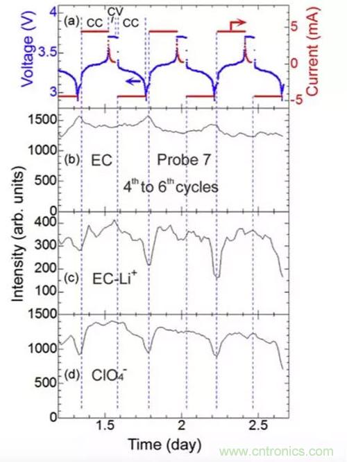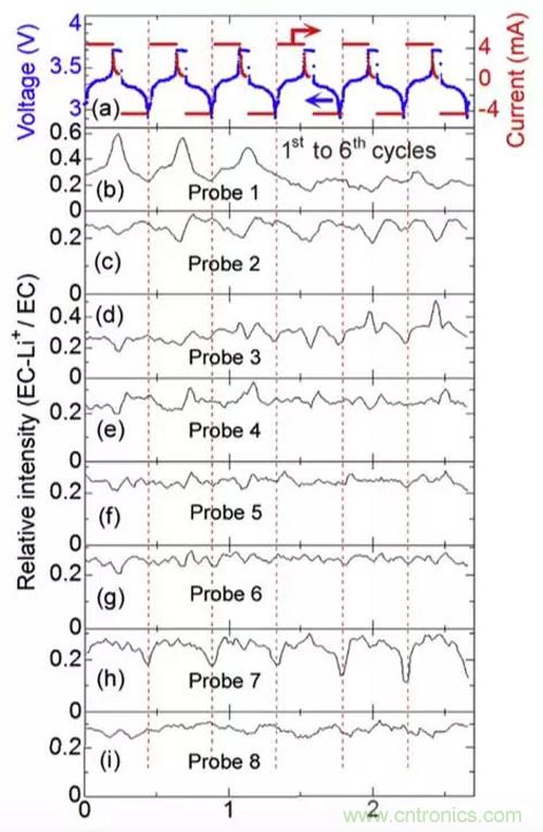 在研究Li+濃度的變化過程中,Toshiro Yamanaka還發(fā)現(xiàn)電解液的分布也隨著充放電而發(fā)生變化。下圖是在充放電過程中不同位置溶劑EC的強(qiáng)度的變化趨勢,EC的強(qiáng)度變化主要反映該處電解液的數(shù)量多少,隨著電芯的體積變化,電芯內(nèi)的電解液分布也在不斷的發(fā)生著變化。例如在1號和2號位置,EC的濃度發(fā)生了兩次快速下降和緩慢恢復(fù),6號探測器的位置,則出現(xiàn)了EC濃度的快速下降和快速上升,這些變化都反映了鋰離子電池內(nèi)部在充放電過程中,由于電極的體積膨脹,導(dǎo)致電解液在電芯的局部發(fā)生變干、再浸潤的過程。