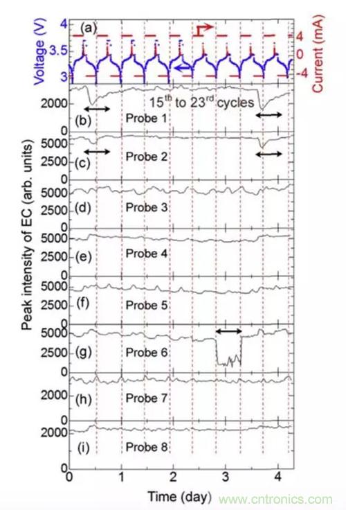 但是在循環(huán)30次以后,從1號光纖探測器到7號光纖探測器Li+濃度變化趨勢都變的一致,充電的時候濃度上升,放電的時候濃度下降,Toshiro Yamanaka認(rèn)為這主要是因為在循環(huán)30次后,負(fù)極的SEI膜的結(jié)構(gòu)和成分逐漸穩(wěn)定,從而電芯的各個部分之間離子阻抗趨于一致的結(jié)果。但是每個光纖探測器的變化趨勢也有所不同,例如3號和4號光纖探測器位置充放電過程中離子濃度的變化就比較小,2號光纖探測器處的離子濃度變化逐漸變小,而5號探測器位置的離子濃度變化則逐漸增大。這表明此時鋰離子電池內(nèi)部仍然存在著較大的不均勻性,例如4號位置離子濃度變化比較小,表明此處在充放電過程中的反應(yīng)速率較慢,引起局部SoC的不均勻,從而對電池的性能產(chǎn)生負(fù)面的影響。