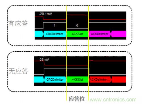 為什么會發生這種錯誤呢?發送報文的節點會在ACK段發送兩個隱性位,若在第一個位期間接收到顯性電平則認為該幀被正確接收。由于仲裁段相同時兩節點都認為自己取得仲裁權,在ACK段等待應答,但該網絡中僅存在兩個節點,因此在ACK段不能收到應答,進而發生應答定界符錯誤。簡單說來這種情形就類似于總線中只有一個節點將不能實現數據發送。圖7是在ACK段有無應答時的波形對比。