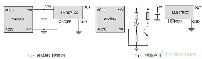 因此推薦使用電路(b),外置簡(jiǎn)單的欠壓鎖定,使24V模塊輸出電壓建立到預(yù)置值后再啟動(dòng)LM2576等外接開(kāi)關(guān)電源芯片,可以很大程度上避免啟動(dòng)不良問(wèn)題。
