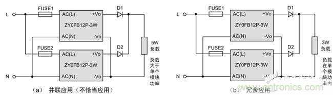 如上圖電路(a)所示,負(fù)載需5W功率,超出單個(gè)模塊的帶載能力,則其中一個(gè)模塊可能存在超負(fù)荷使用的情況。對(duì)于此種應(yīng)用,需使用單個(gè)大于5W功率的模塊,比如ZY0JGB12P-10W。而電路(b)則不然,每個(gè)模塊的功率均能滿(mǎn)足負(fù)載的需要,此時(shí)屬于冗余設(shè)計(jì)。