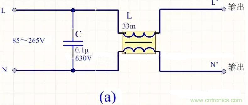 為降低成本和減小體積,開關電源一般采用簡易的EMI濾波器,主要包括共模扼流圈L和濾波電容,以下四種可以根據(jù)情況進行選擇: