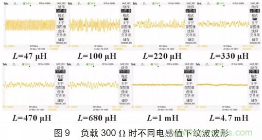 圖9 所示為負載為300 Ω 時不同電感值下紋波波形圖,從圖9 中可以看出,隨電感值增大,紋波被抑制程度越大,輸出紋波越小。當(dāng)電感值增大到1 mH 時,紋波效果最好,且輸出基本上沒有毛刺。