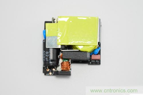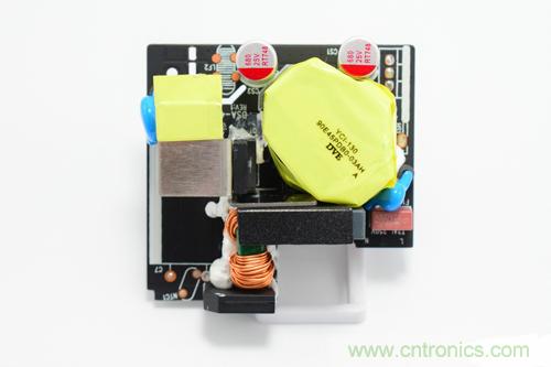 由于沒有使用SR技術(shù),PCB背面元器件較少,主要是位于左上的 LD5760E,來自通嘉科技的PWM控制器,與前述的東芝TK10A60W組成一次側(cè)電路。左下方的白色器件為CT1019光耦,用于電壓反饋。