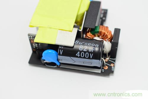 全橋整流后的一次側(cè)濾波電源為一枚82μF/400V 電容,來自SUSCON(臺(tái)灣冠坤)。從此角度看,屬于保護(hù)電路的NTC空缺未安裝。