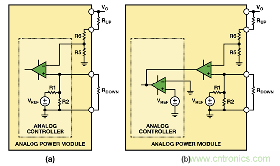 圖2. 利用 (a) 帶有可配置內(nèi)部基準電壓的模擬控制器,或者(b) 帶有固定內(nèi)部基準電壓的模擬控制器調(diào)整模擬電源模塊的輸出電壓