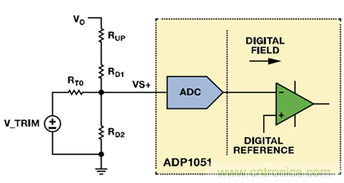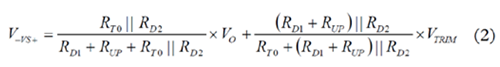VS+引腳上的正常工作電壓為1 V。若VTRIM為1 V左右且RT0遠大于RD2,則可忽略電路的其余分支部分。復(fù)合網(wǎng)絡(luò)用作簡單分壓器,并調(diào)節(jié)RUP電阻值,提供類似于模擬控制器的特性,實現(xiàn)了模擬電源模塊中的電壓向上調(diào)整。