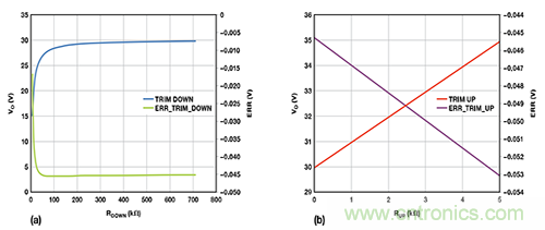 圖6. 使用重新配置的反饋網(wǎng)絡(luò)后,調(diào)整ADP1051輸出電壓的計算結(jié)果:(a) 向下調(diào)整 (b) 向上調(diào)整