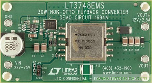 圖 3 示出了一款采用 LT3748 的演示電路板。該電路可接受一個范圍從 22V 至 75V 的 輸 入 電 壓, 并 在 高達 2.5A 的電流條件下產生一個隔離型12V 輸出。