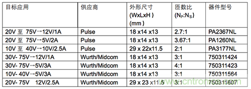 表 1:可供 LT3748 使用的市售變壓器。