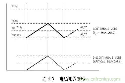Buck/Boost型開關(guān)電源,伴隨開關(guān)管的開和關(guān),儲(chǔ)能電感的電流波形如圖1-3所示: