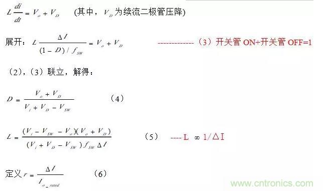 此值一般為常量。從(5)式可以得到:電感值越大,I?就越小,因此r就越小。但這往往導(dǎo)致需要一個(gè)很大的電感才能辦到,所以絕大部分的Buck型開關(guān)電源選擇r值在0.25~0.5之間。