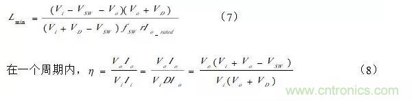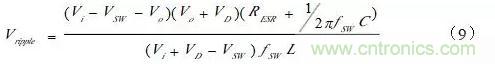 對(duì)像手機(jī)、PMP、數(shù)據(jù)卡這類的消費(fèi)類電子用到的低功率開關(guān)電源,V(sw)和V(D)都在0.1V~0.3V之間,因此可對(duì)公式(7)、(12)進(jìn)行簡化,得到: