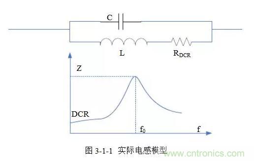 理想模式的電感,其阻抗與頻率呈線性關(guān)系,會(huì)隨頻率升高而增大。實(shí)際電感模型如圖3-1-1所示,由電感L串聯(lián)R(DCR)和寄生電容C并聯(lián)而成,存在自激頻率f(o)。頻率小于f(o)時(shí)呈感性,大于f(o)時(shí)呈容性,在f(o)處阻抗最大。