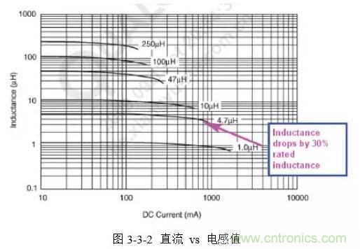 電感的飽和電流I(SAT)指其感值下降了標(biāo)稱值的10%~30%所能通過的最大電流。如圖3-3-2所示,4.7uH電感下降為3.3uH時(shí)的電流約為900mA,因此其I(SAT)(30%)是900mA。