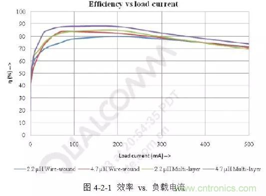 但是,疊層電感的SATI也較小,因此其在重載時(shí)會(huì)有較大的紋波電流,導(dǎo)致輸出的紋波電壓也相應(yīng)增大。圖4-2-1所示是Taiyo Yuden的兩種繞線電感與三星的兩種疊層電感負(fù)載電流和效率的關(guān)系曲線。
