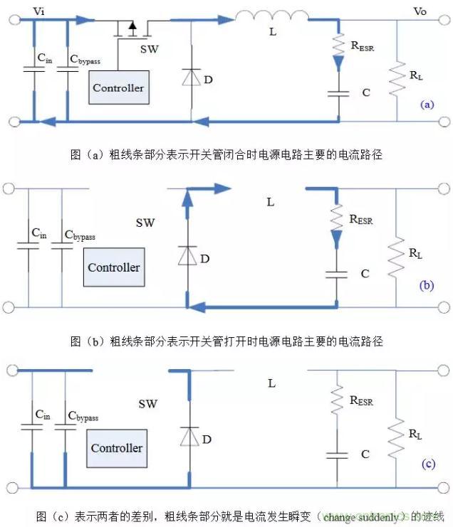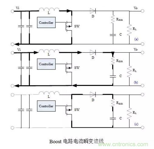 以Buck電路為例,不管開關(guān)管是由閉合-打開還是打開-閉合,電流發(fā)生瞬變的部分都如圖(c)所示,它們是會(huì)產(chǎn)生非常豐富的諧波分量的上升沿或下降沿。通俗的講,這些會(huì)產(chǎn)生瞬變的電流跡線(trace)就是所謂的“交流”(AC current),其余部分是“直流”(DC current)。當(dāng)然這里交直流的區(qū)別不是傳統(tǒng)教科書上的定義,而是指開關(guān)管的PWM頻率只是“交流”FFT變換里的一個(gè)分量,而在“直流”里這樣的諧波分量很低,可忽略不記。所以儲(chǔ)能電感屬于“直流”也就不奇怪,畢竟電感具有阻止電流發(fā)生瞬變的特性。因此,在開關(guān)電源布局時(shí),“交流”跡線是最重要和最需要仔細(xì)考慮的地方。這也是需要牢記的唯一基本定律(only basic rule),并適用于其它法則和拓?fù)洹O聢D表示了Boost電路電流瞬變跡線,注意它和Buck電路的區(qū)別。
