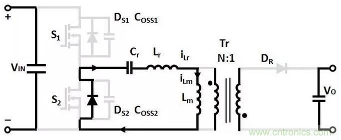 T1時(shí)刻,S1關(guān)斷,(Coss1+Coss2)和(Lr+Lm)諧振,Coss1充電,Coss2放電,直到T2時(shí)刻,Coss1的電壓充電到VIN,Coss2的電壓放電到0。