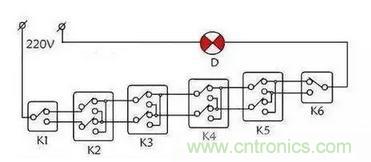 六地控一燈原理接線示意圖