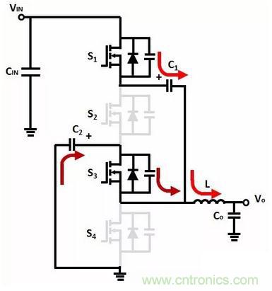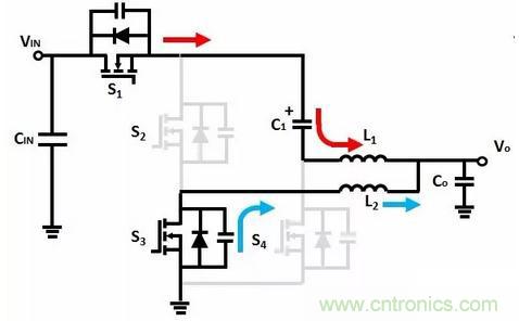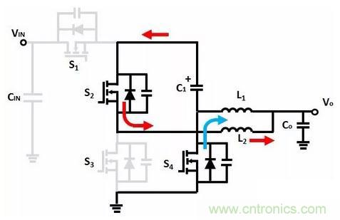 L1激磁,輸入電壓通過C1向輸出負(fù)載提供能量,同時(shí)對C1充電; L2去磁,S4續(xù)流。