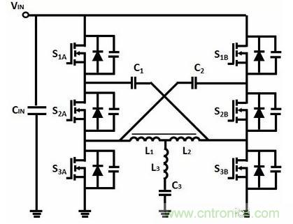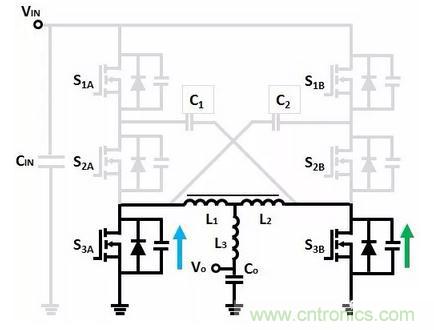如果C1、C2的電容相等,電感電流等于電容C1、C2的電流之和。S1、S3工作于硬開關(guān)狀態(tài),由于S1、S3的電流降低,因此可以同時(shí)降低導(dǎo)通損耗和開關(guān)損耗。
