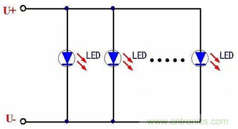 這種串聯連接的方式電路比較簡單,首尾連接在一起,LED工作時流過的電流一致很好,由于LED屬于電流型器件,因此基本可以保證每個LED的發光強度一致。采取這種LED連接方式的電路簡單、連接方便。但是也有一個致命的缺點,那就是當其中一個LED發生開路故障時,將造成整個LED燈串的熄滅,影響了使用的可靠性,這就需要保證每個LED的質量過硬,這樣可靠性也就相應的提高。