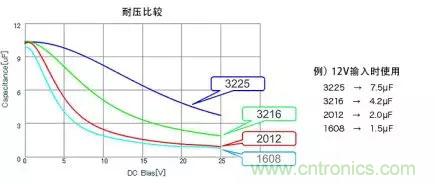 關(guān)于DC偏置,當然須選擇影響少的,不過即使電容值、耐壓相同,變動特性也會因封裝尺寸而異。下方圖表為其一例,顯示尺寸大者變動少??傊?,請務(wù)必從電容器廠商取得充分的信息。