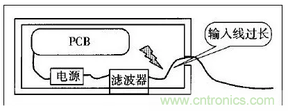 許多設(shè)備的電源線進(jìn)入機(jī)箱后,經(jīng)過(guò)很長(zhǎng)的導(dǎo)線才接到濾波器的輸入端。例如,電源線從機(jī)箱后面板輸入,走行到前面板的電源開(kāi)關(guān),又回到后面板接到濾波器。或者濾波器的安裝位置距離電源線入口較遠(yuǎn),造成引線太長(zhǎng)(如圖1所示)。