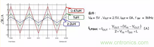 在這里,為加深對電感工作的理解,進一步說明電感值變化時電感電流如何變化的情形。下圖表示在相同工作條件下將電感值設為0.4μH、1μH、2.2μH時ILPEAK。