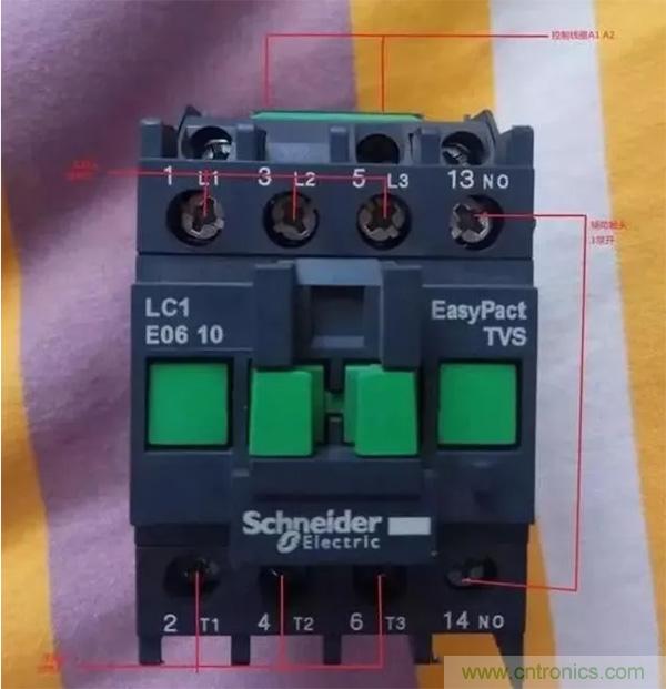 如上圖所示,接觸器共有六個主觸點,1,3,5為主觸點進線孔,2,4,6為主觸點出線孔,A1,A2為接觸器線圈的兩個接線端子,在接觸器的主觸點的稍下方。也有的接觸器A2有兩個接點,我們在運用的時候隨便接哪一個都行。線圈接線不分零火。