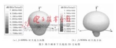 為了更形象地描述天線的方向性,軟件可以給出三維方向圖。頻率為60MHz和90MHz時天線的三維方向圖如圖5所示。表1給出天線的方向性系數 。