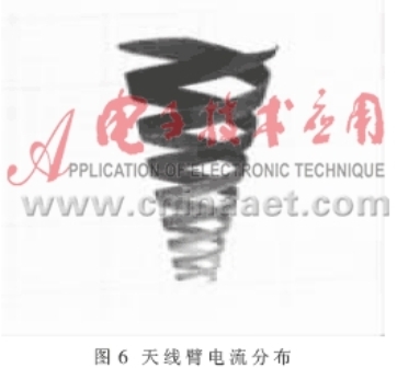 圖6表示頻率f=80MHz時電流在天線臂上的分布,可以看出傳導電流從天線饋電點(即圓錐頂部一端)流入,先經過傳輸區(約下面的2圈),再向上是輻射區(約第3圈),最后為衰減區(后面幾圈)。在傳輸區內,電流大小變化不明顯,到達輻射區后,隨著大量能量以電磁波的形式傳播,電流迅速減小,最后經過衰減區,電流逐漸減小至零,這符合天線一般規律。其中,輻射區的位置與頻率有關,即位于波長近似于圓錐截面周長的地方。可以想象,不同頻率會對應不同的輻射區位置,這是CLS天線的工作特性,也是CLS天線具有寬帶特性的原因。