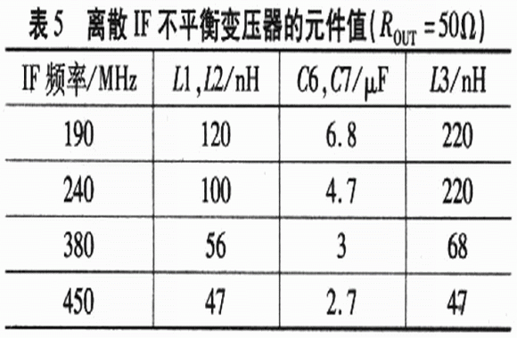 通用IF頻率下離散IF不平衡變壓器的元件值如表5所示。由于電路板和寄生效應(yīng)的影響,表5中的值與計(jì)算值略有差別。