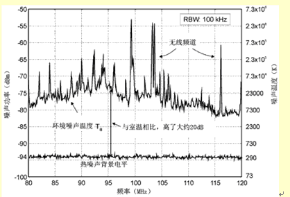 由現場測試可知,在接收FM調頻信號時,ActivvTM有源天線的性能相當于耳機連接線型天線,雖然這兩種天線的尺寸有很大差別。考慮到有源天線的體積小,它的幅射電阻大約只有1mΩ,而寄生損失電阻至少有1Ω左右,增益在-30~-50dBi的范圍內。對于大多數RF工程師來講,這樣的增益是很難接受的。但是有一個因素極大地放寬了接收FM調頻信號時對增益的要求,即很高的環境噪聲溫度。圖8是一個消聲室(為了得到保守的估計)在屏蔽裝置拿走后的噪聲電平。大多數無線系統工作在頻率高于1GHz的范圍,環境噪聲接近室溫,增益為-10dBi,相當于信噪比降低了10dB,在FM頻段內,在城市的大部分地區,由于人為噪聲的影響,噪聲電平高了大約20dB(對于調幅會更高)。因此,與完美的雙極電線相比,效率差的天線收到的信號較弱,噪聲較小。圖9給出了增益不同(0、-20、-40dB)的三種天線不同噪聲溫度時的G/T值。所有三種天線都接到噪聲指數為6dB的接收器上。對于增益為-40dB的實際天線(在室溫下G/T值減少46dB),當情況相同時,在23.000K的典型溫度下性能提高了19dB。對于有源天線,通過壓制接收器的噪聲指數,可以把性能再提高6dB。所以,從信噪比方面看,增益為 -40dB的無源天線,只比完美的雙極天線差27dB。