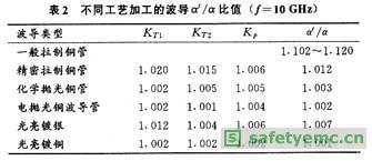 由Benson和AILison對(duì)各種不同工藝加工的口徑為25.4mm×12.7mm銅波導(dǎo)管,測(cè)出KT1,KT2,Kp之后,據(jù)上式算出的α′/α之值見(jiàn)表2[1]。[page]