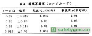 以23mm×10mm的波導(dǎo)為例,在f=10GHz時(shí)不同類(lèi)型的安裝誤差所引起的駐波比見(jiàn)表4-表7。